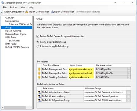 We are setting up SQL Always On for BizTalk Server 2016. I have created 4 named instances on each node. Everything works fine, but I wonder why you are not providing the Instance name when configuring the Data stores in the BizTalk Server Configuration. How can this work? As far as I know, this is not possible because you always have to provide the Instance name. Did you use SQL Aliases?