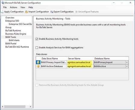One thing I noticed that in Bam configuration, you specified BAM Archive database to be on ‘agmgmt’ availability group. The linked servers on the primary instances are created during BizTalk Server configuration as needed, as you say completely normal in an environment with several SQL Server environment.