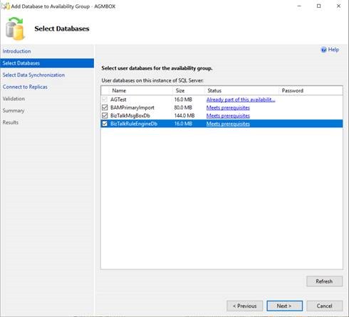 3.       Now add BIzTalk databases to the respective Availability Groups.