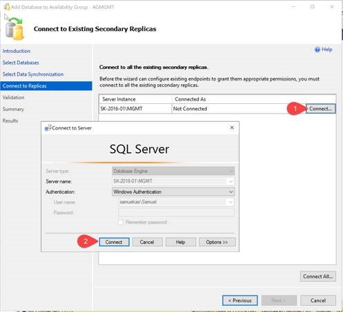 5.       On the Replicas Tab: The local Server instance is automatically added.Add the Secondary Server, specify automatic failover and Synchronous commit. Also, make the replicas readable, if you don’t the jobs will fail on the secondary servers which pollutes the logs.clip_image024[4]